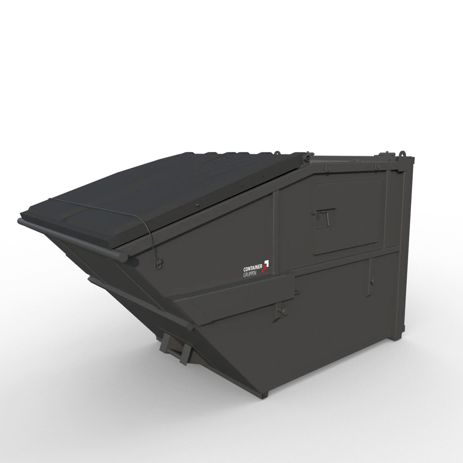 En container där du kan tömma på flera olika sätt, antingen med frontlastare, baktömmande- och liftdumperbil. Containrarna är lämpliga där du behöver täcka innehållet.